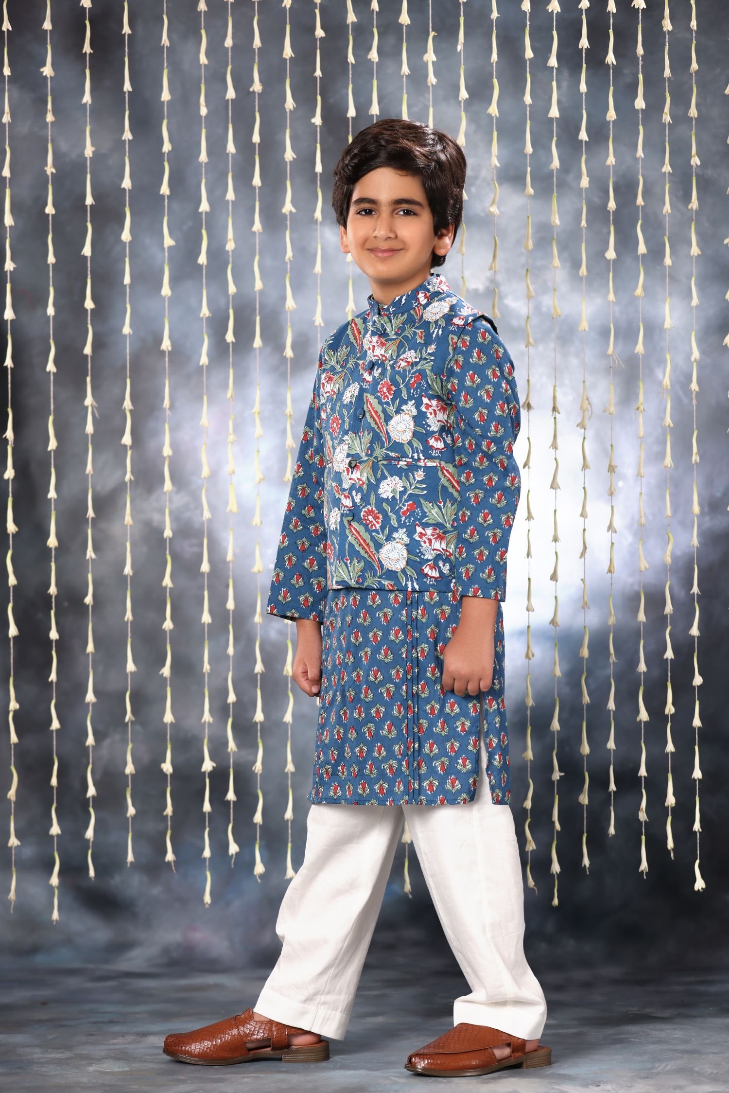 Exude effortless charm with this Blue Jaipuri Handblock Buti Print Kurta with White Pant Co-ord Set and Blue Floral Jacket from Pret a Porter. Crafted in a premium cotton blend, this ensemble beautifully merges tradition and style. The blue handblock buti print kurta is complemented by crisp white pants, creating a refined contrast, while the floral printed jacket adds a sophisticated layering element. Perfect for festive gatherings, family celebrations, or semi-formal events, this ready-to-wear co-ord set offers both comfort and elegance. The soft, breathable fabric and carefully tailored fit make it ideal for all-day wear. Available in standard sizes, this chic ethnic ensemble is priced between ₹4949 – ₹6099, making it a perfect pick for modern ethnic fashion lovers.