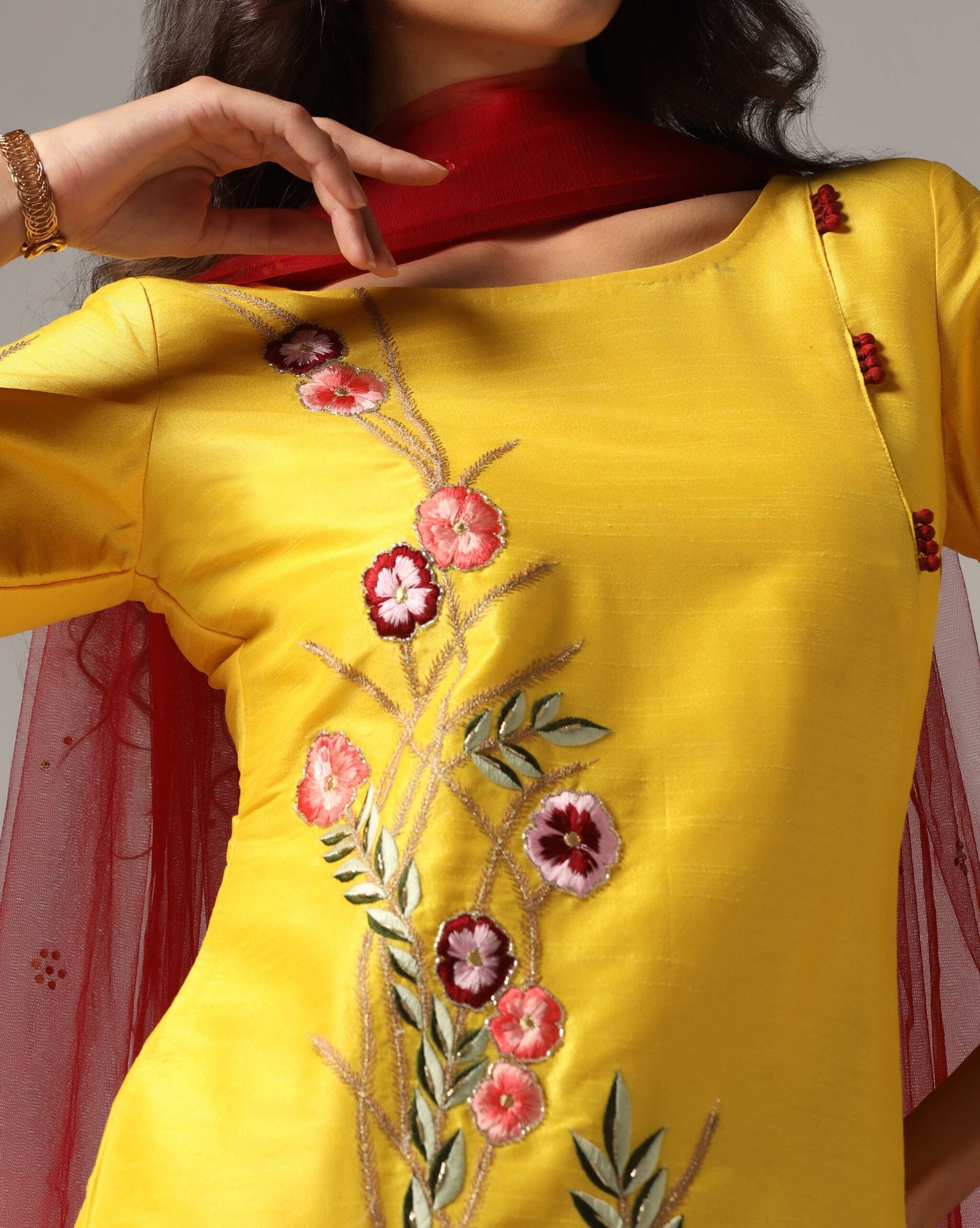 Pret a Porter | SKU: 9900617 | Yellow Raw Silk Kurti with Pants & Dupatta
