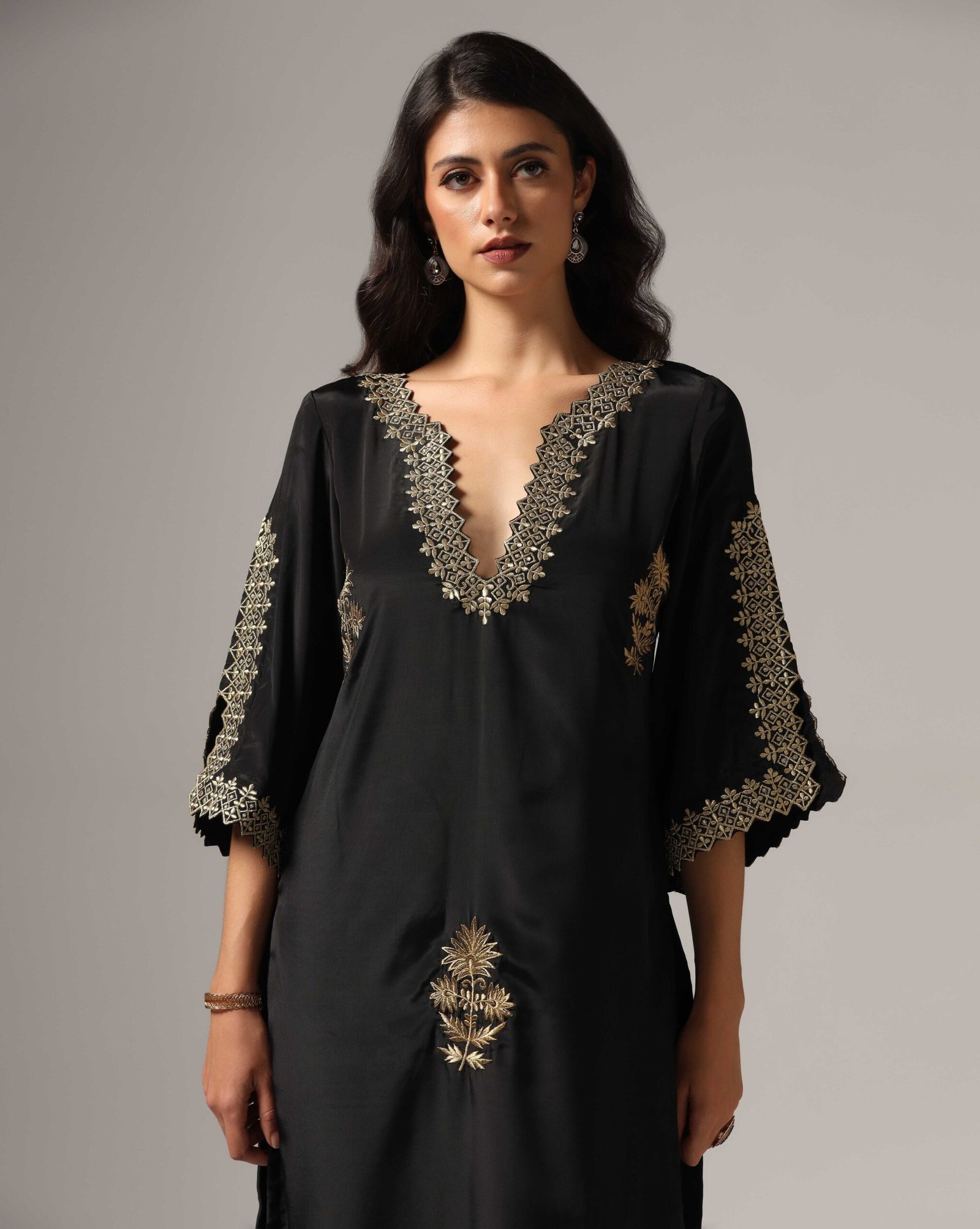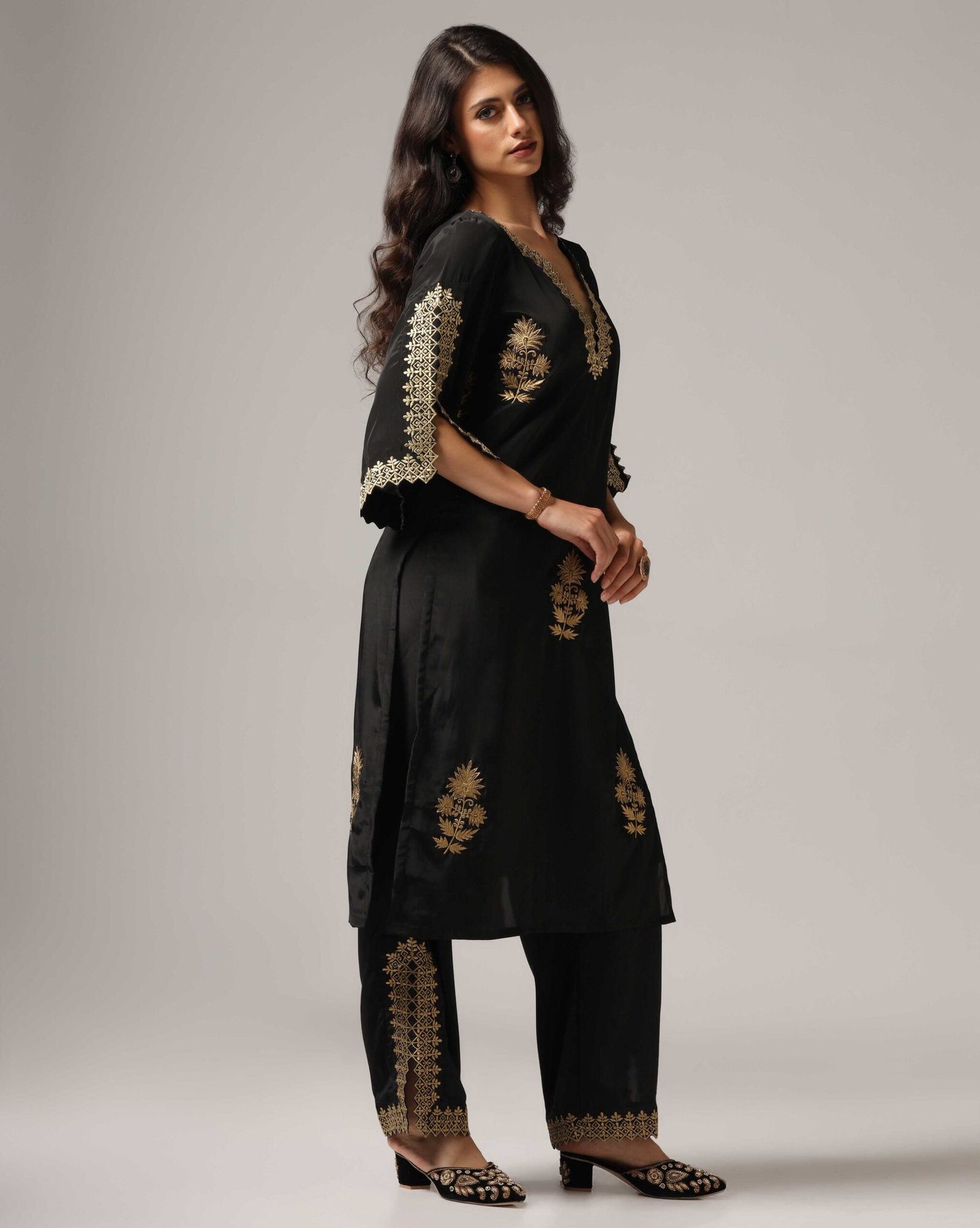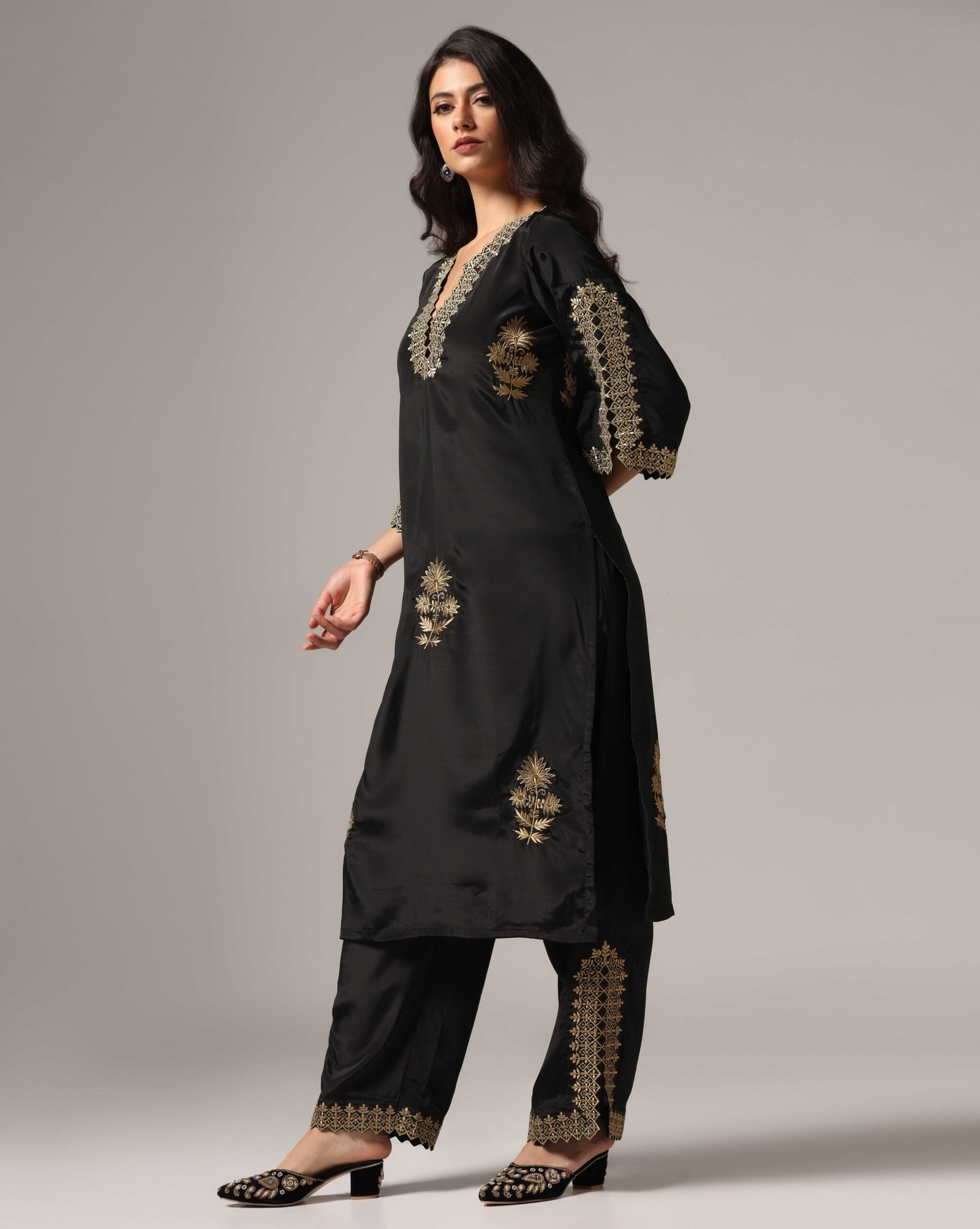 A stylish and versatile choice, this black French crepe kurti set features antique gold zari embroidery, adding a touch of luxury. Paired with palazzo pants, it ensures ease and comfort without compromising on elegance. Designed for modern festive gatherings and evening outings, this set is a timeless must-have for women who prefer minimal yet impactful fashion.