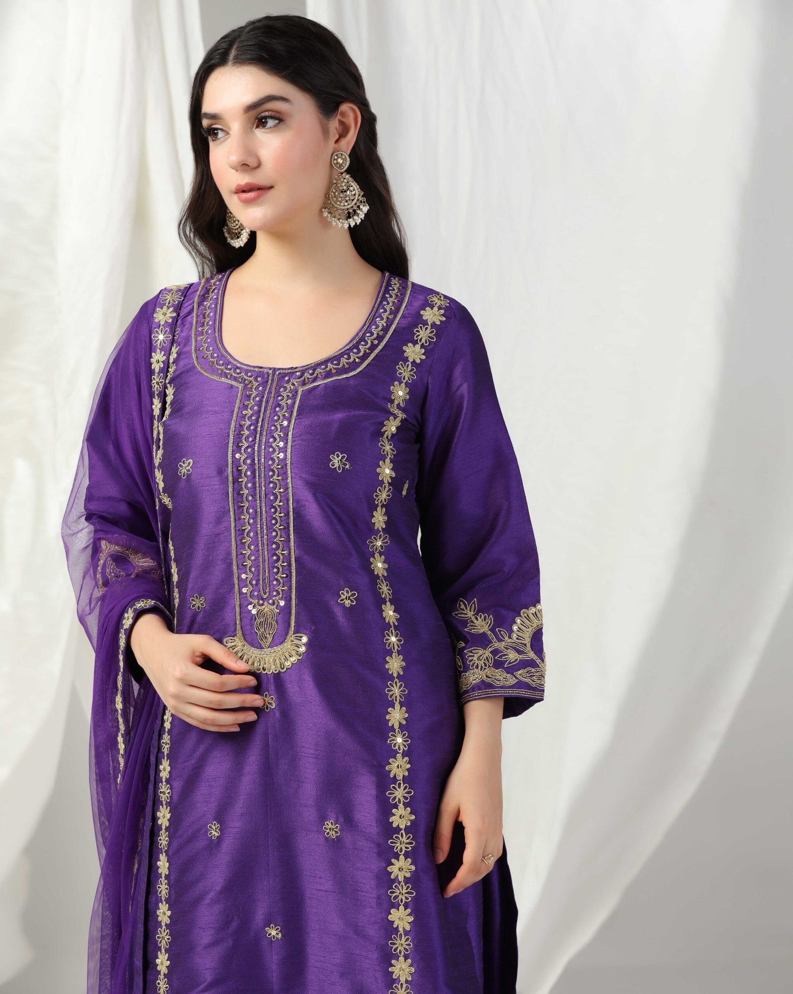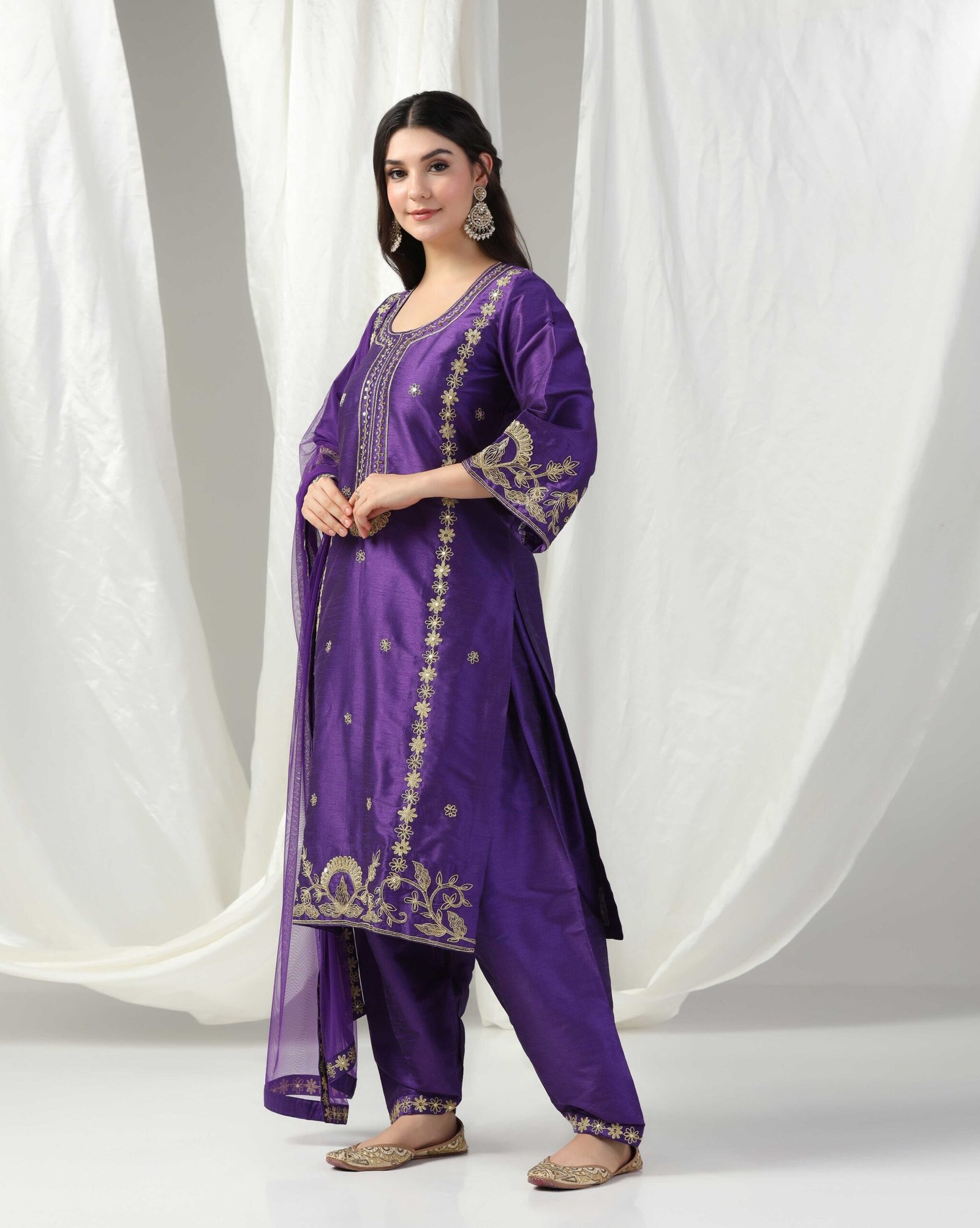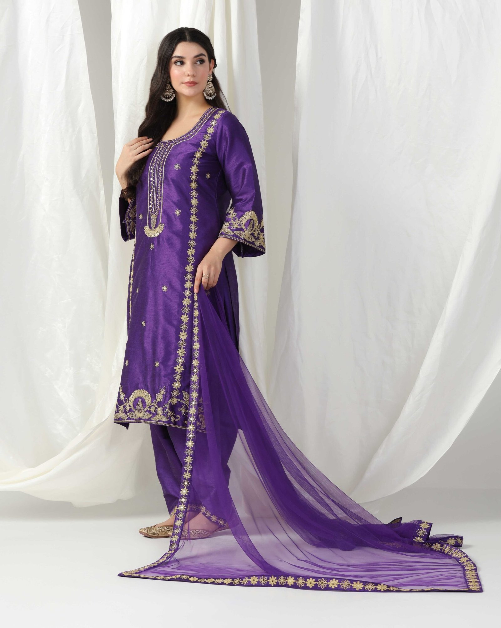 Step into elegance with the Pret a Porter Elegant Purple Raw Silk Suit, a masterpiece of craftsmanship and style. Designed in luxurious raw silk, this stitched suit is adorned with exquisite dori hand embroidery, further highlighted with sequins and cut-dana embellishments that lend it a graceful shimmer. The set comes complete with a perfectly tailored suit, a matching salwar, and a soft net dupatta, creating a regal and timeless ensemble. With a 44-inch suit length, 38-inch bust, 32-inch sleeve, and a 60-inch dupatta, it offers a flattering silhouette and comfortable wear. Weighing just 600 grams, it is lightweight yet elegant, making it perfect for festive gatherings, weddings, or evening occasions. Priced at ₹5800 with 5-day delivery, this handcrafted suit in a royal purple hue is a must-have for your ethnic collection.