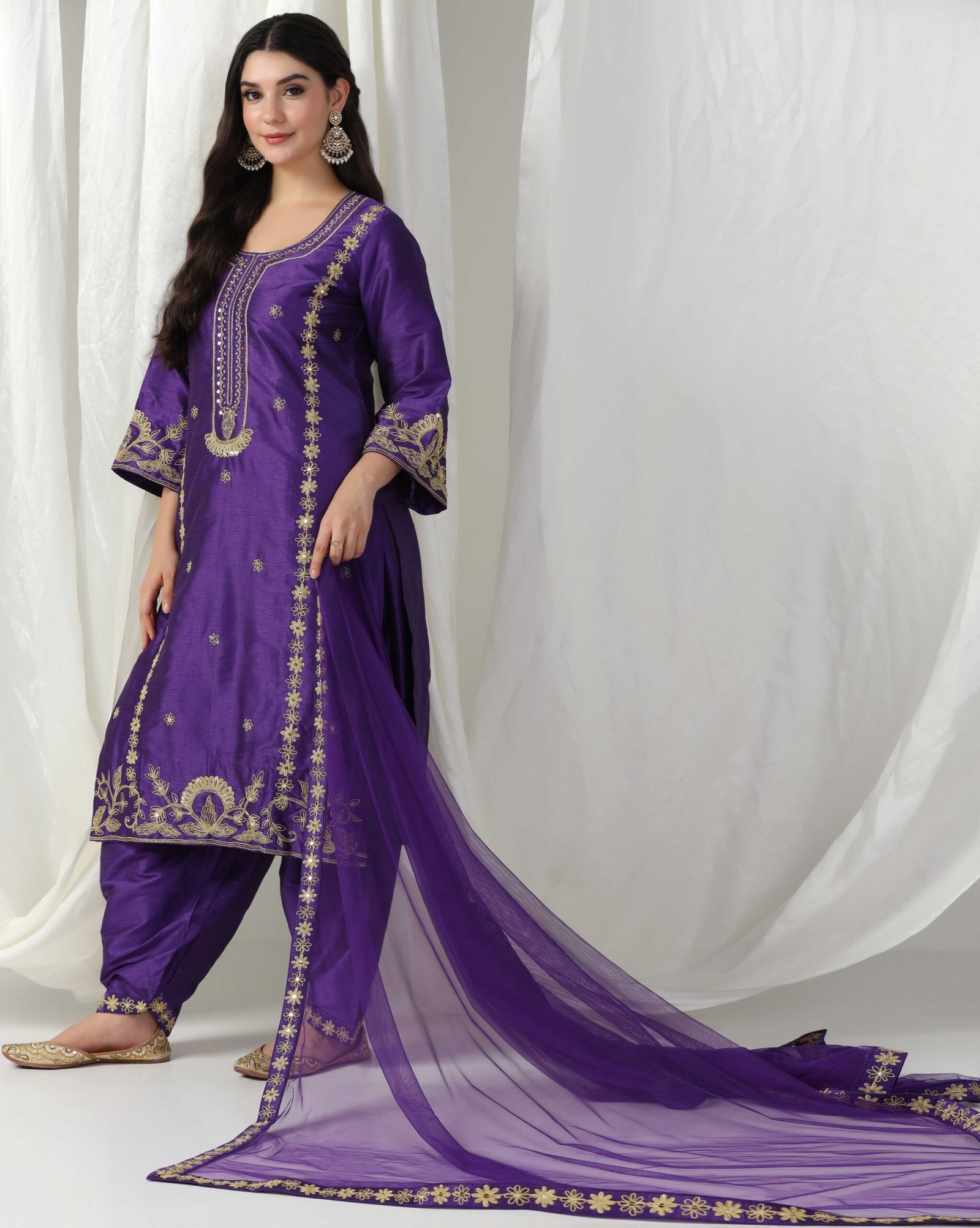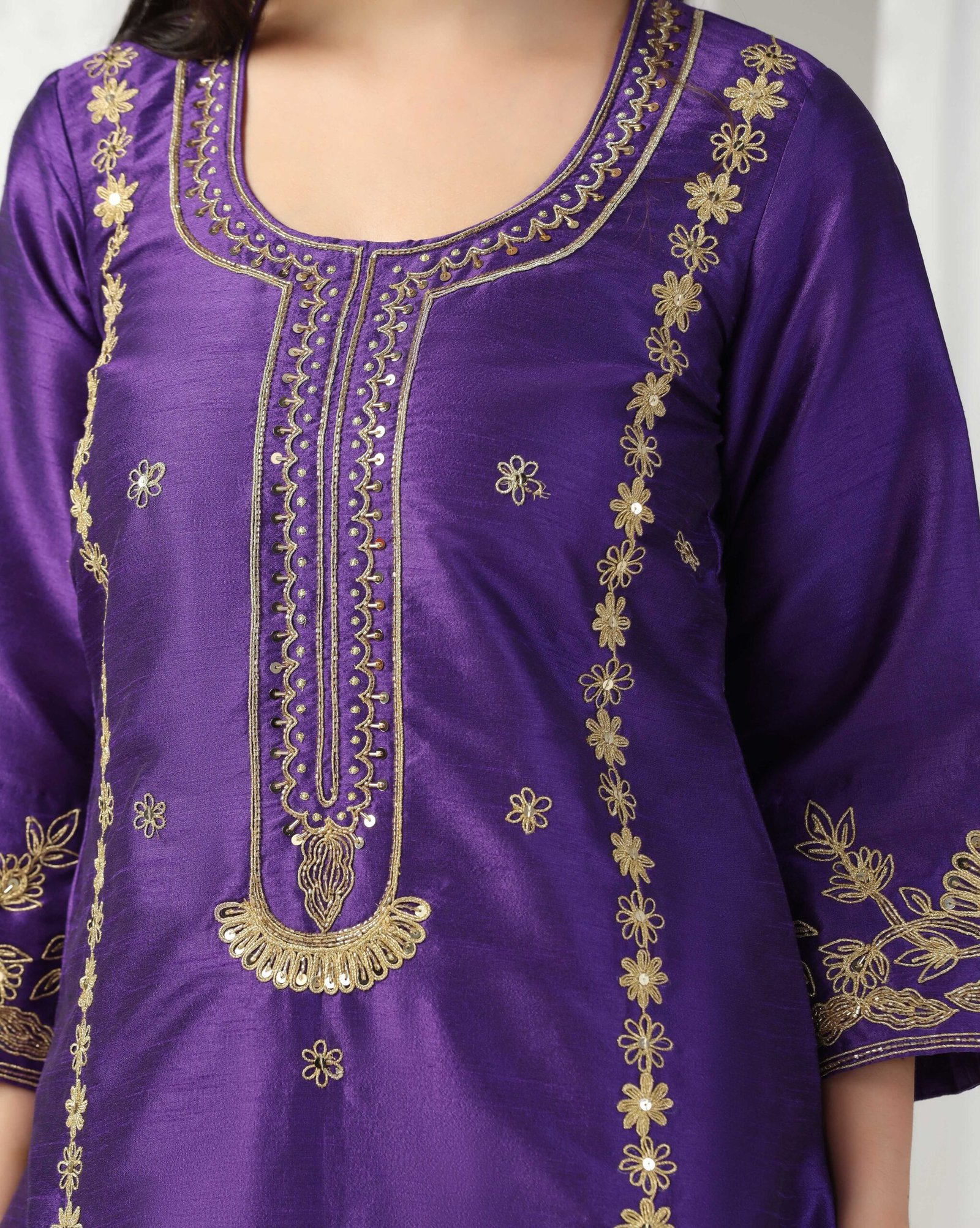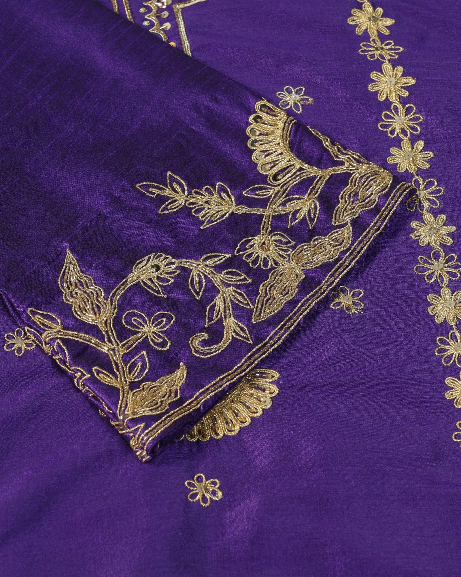 Step into elegance with the Pret a Porter Elegant Purple Raw Silk Suit, a masterpiece of craftsmanship and style. Designed in luxurious raw silk, this stitched suit is adorned with exquisite dori hand embroidery, further highlighted with sequins and cut-dana embellishments that lend it a graceful shimmer. The set comes complete with a perfectly tailored suit, a matching salwar, and a soft net dupatta, creating a regal and timeless ensemble. With a 44-inch suit length, 38-inch bust, 32-inch sleeve, and a 60-inch dupatta, it offers a flattering silhouette and comfortable wear. Weighing just 600 grams, it is lightweight yet elegant, making it perfect for festive gatherings, weddings, or evening occasions. Priced at ₹5800 with 5-day delivery, this handcrafted suit in a royal purple hue is a must-have for your ethnic collection.