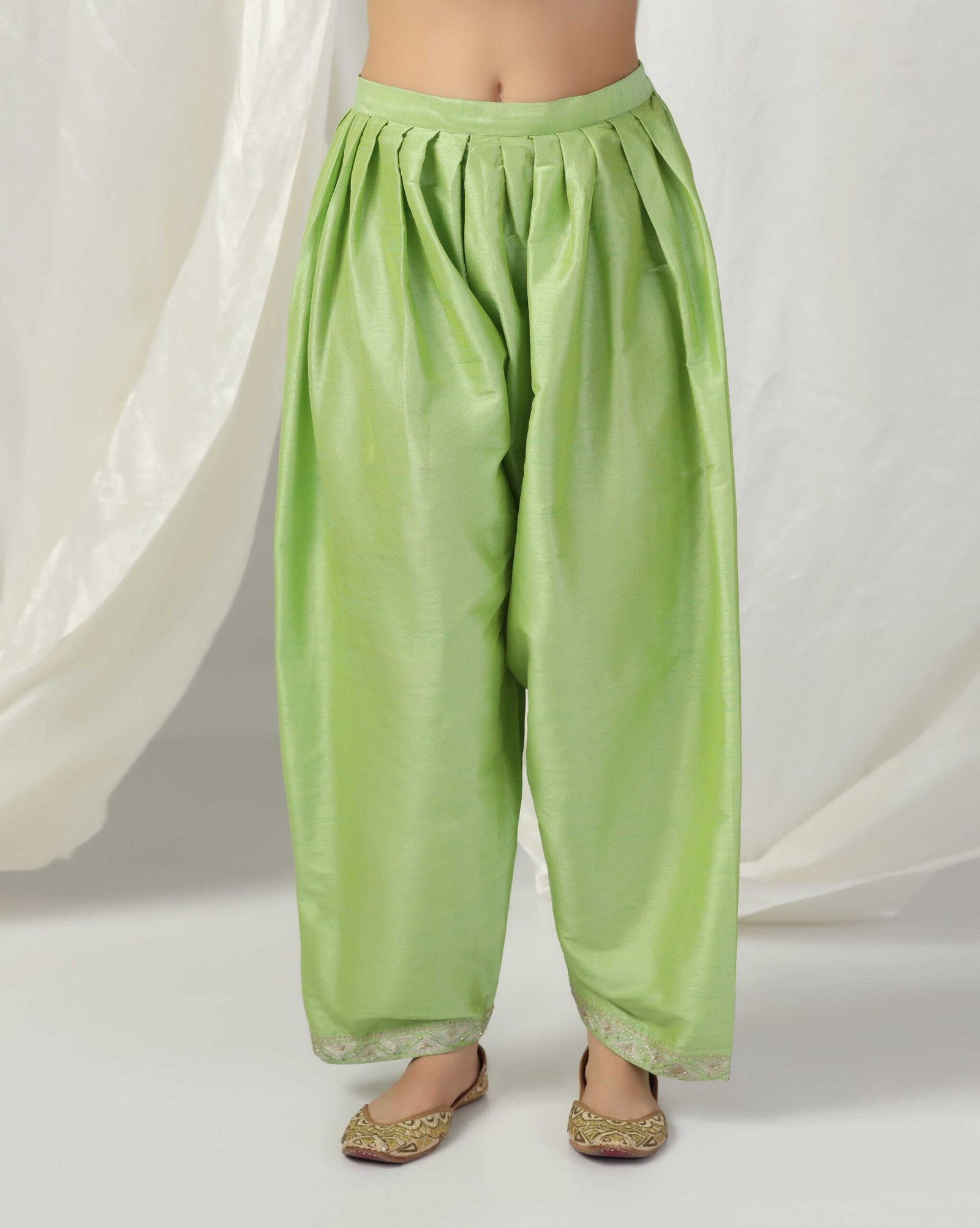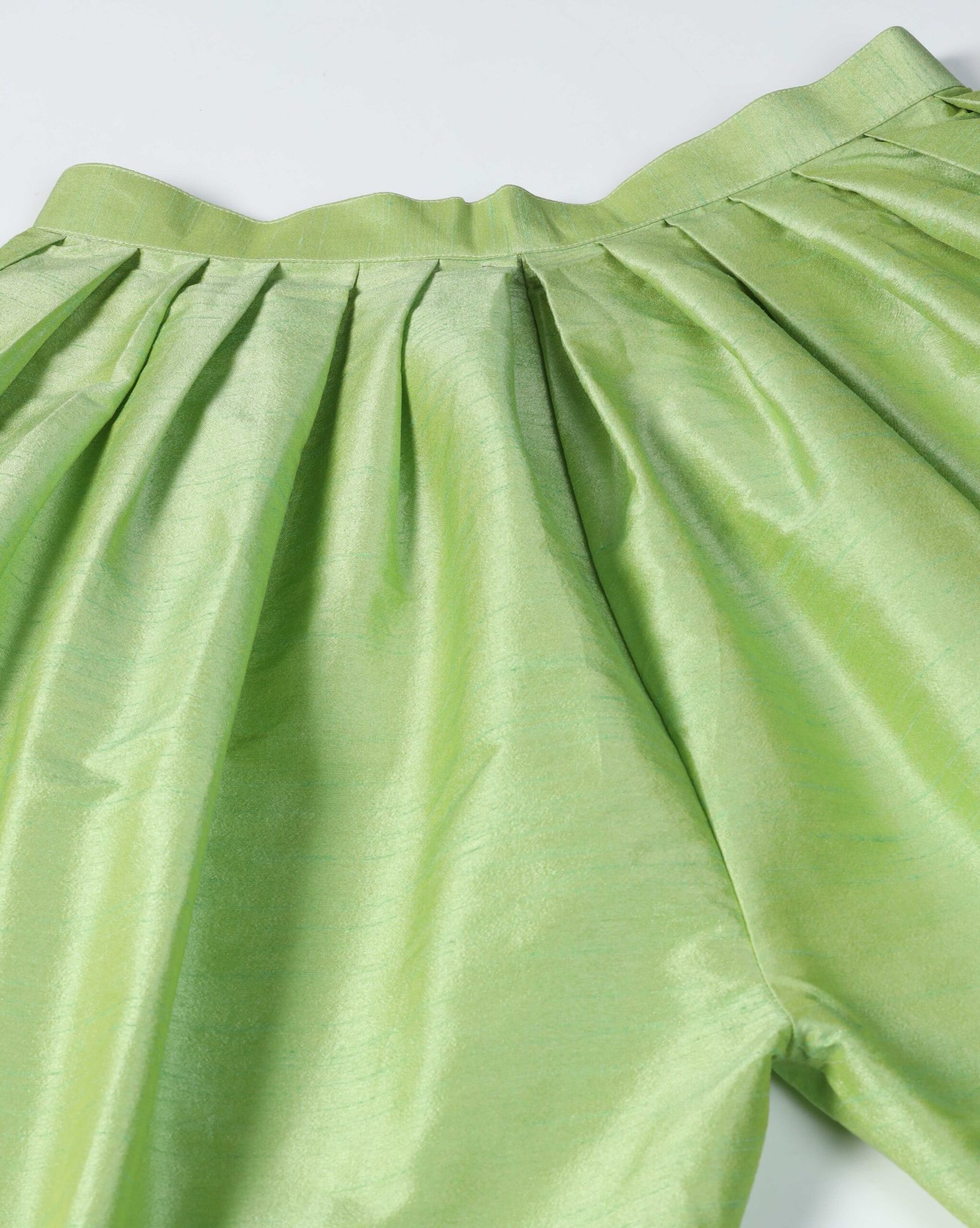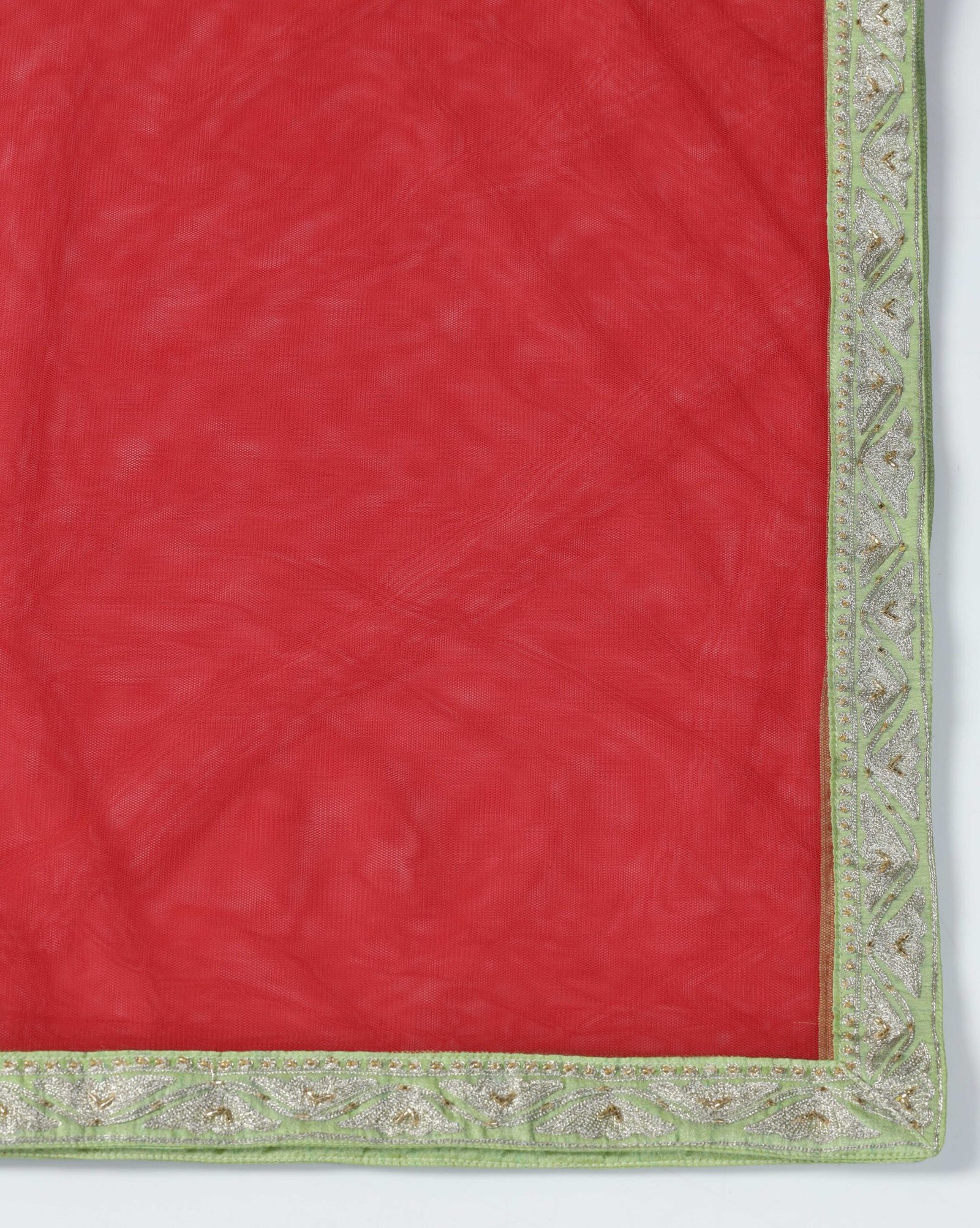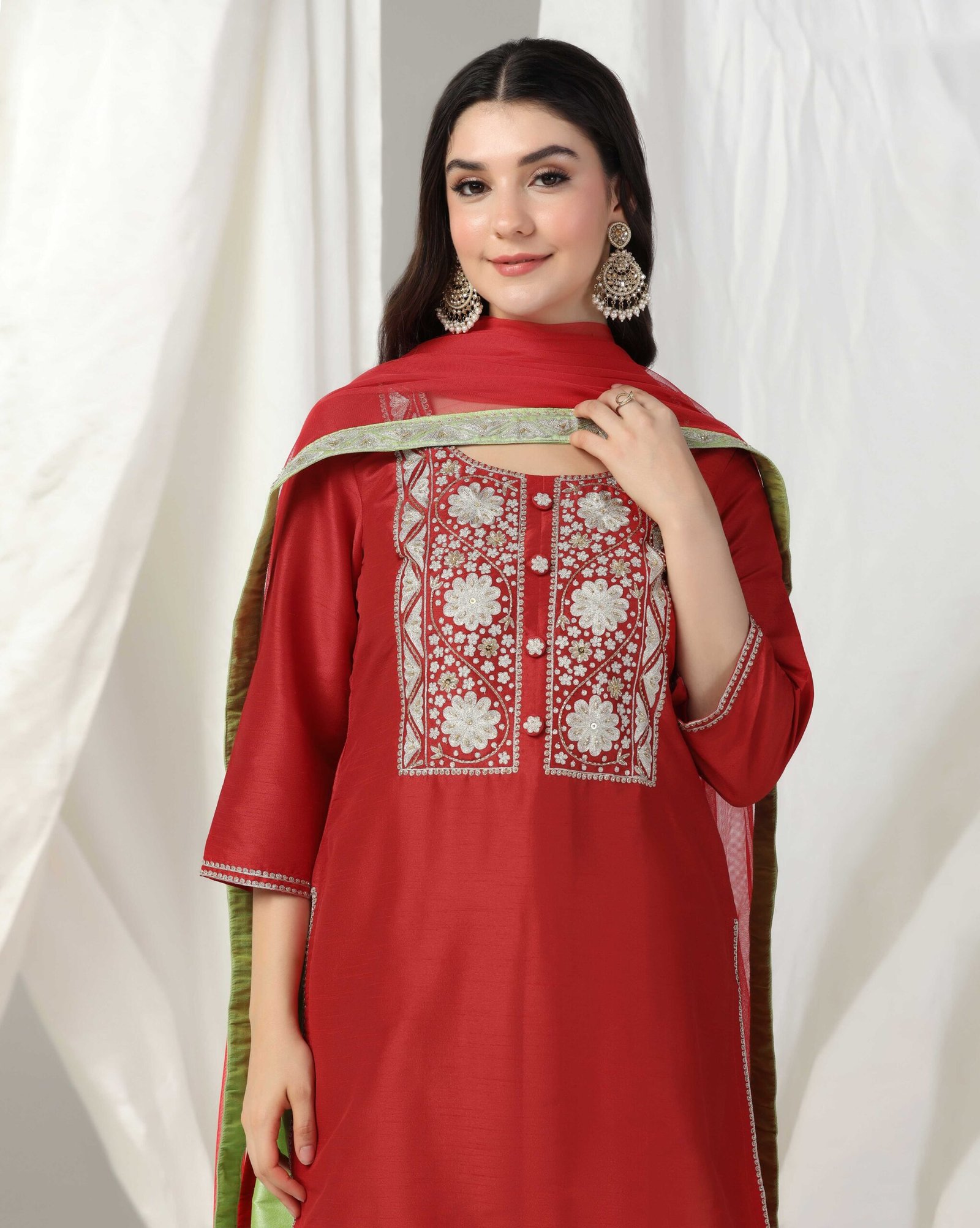 Add a touch of tradition and elegance to your festive wardrobe with the Pret a Porter Red Raw Silk Embroidered Kurti Set. Crafted in rich raw silk, this stitched kurti is adorned with exquisite zari ari embroidery, further enhanced with delicate hand-embroidered seed work, giving it a timeless charm. The ensemble includes a vibrant red kurti, a contrasting green raw silk salwar, and a matching net dupatta, creating a striking combination for any celebration. Designed with comfort in mind, the kurti features a 44-inch length, 38-inch bust, and 32-inch sleeve, paired with a graceful 60-inch dupatta. Weighing just 500 grams, the set is lightweight yet elegant, making it perfect for weddings, festivals, and special occasions. with in 5-day delivery timeline, this handcrafted outfit is a perfect blend of classic artistry and contemporary appeal