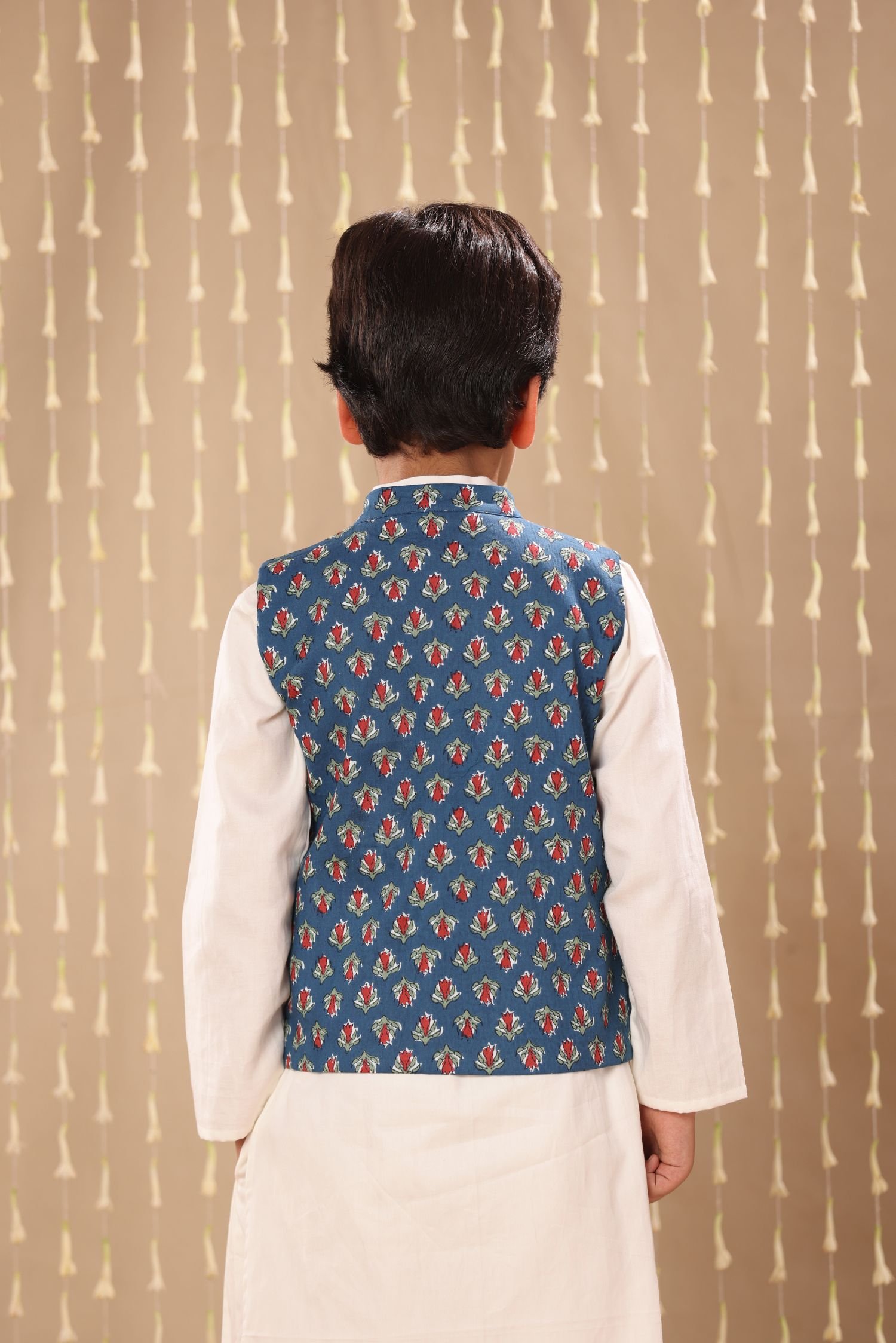 Enhance your ethnic charm with the White Kurta Pyjama Co-ord Set with Blue Jaipuri Buti Print Jacket from Pret a Porter. This beautifully designed three-piece set blends traditional Jaipuri craftsmanship with modern tailoring. The pristine white kurta pyjama offers a timeless base, while the blue buti-printed jacket adds a pop of color and intricate handblock artistry. Ideal for festive occasions, wedding ceremonies, or cultural gatherings, this ensemble promises effortless sophistication and unmatched comfort. Priced between ₹4,949 and ₹6,099, it’s a perfect balance of cultural heritage and contemporary style for today’s gentleman.
