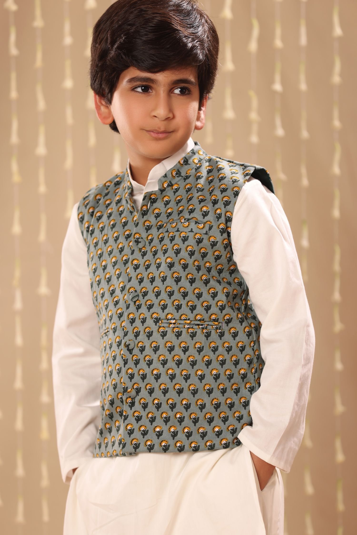 Exude understated elegance with the White Kurta Pyjama Co-ord Set with Grey Jaipuri Floral Print Jacket from Pret a Porter. Crafted from premium cotton blend fabric, this ensemble combines a pristine white kurta pyjama with a refined grey floral Jaipuri jacket. The intricate handblock floral motifs reflect timeless craftsmanship, while the modern tailoring ensures a smart and graceful fit. Perfect for festive occasions, cultural gatherings, or traditional ceremonies, this outfit offers both comfort and class. Priced between ₹4,949 and ₹6,099, it’s a versatile choice for men who appreciate a subtle yet striking ethnic statement.