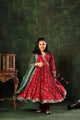 Red Floral Print Angrakha Style long full skirt Anarkali Kurta paired with Plain red Churidar salwar and Dupatta.
